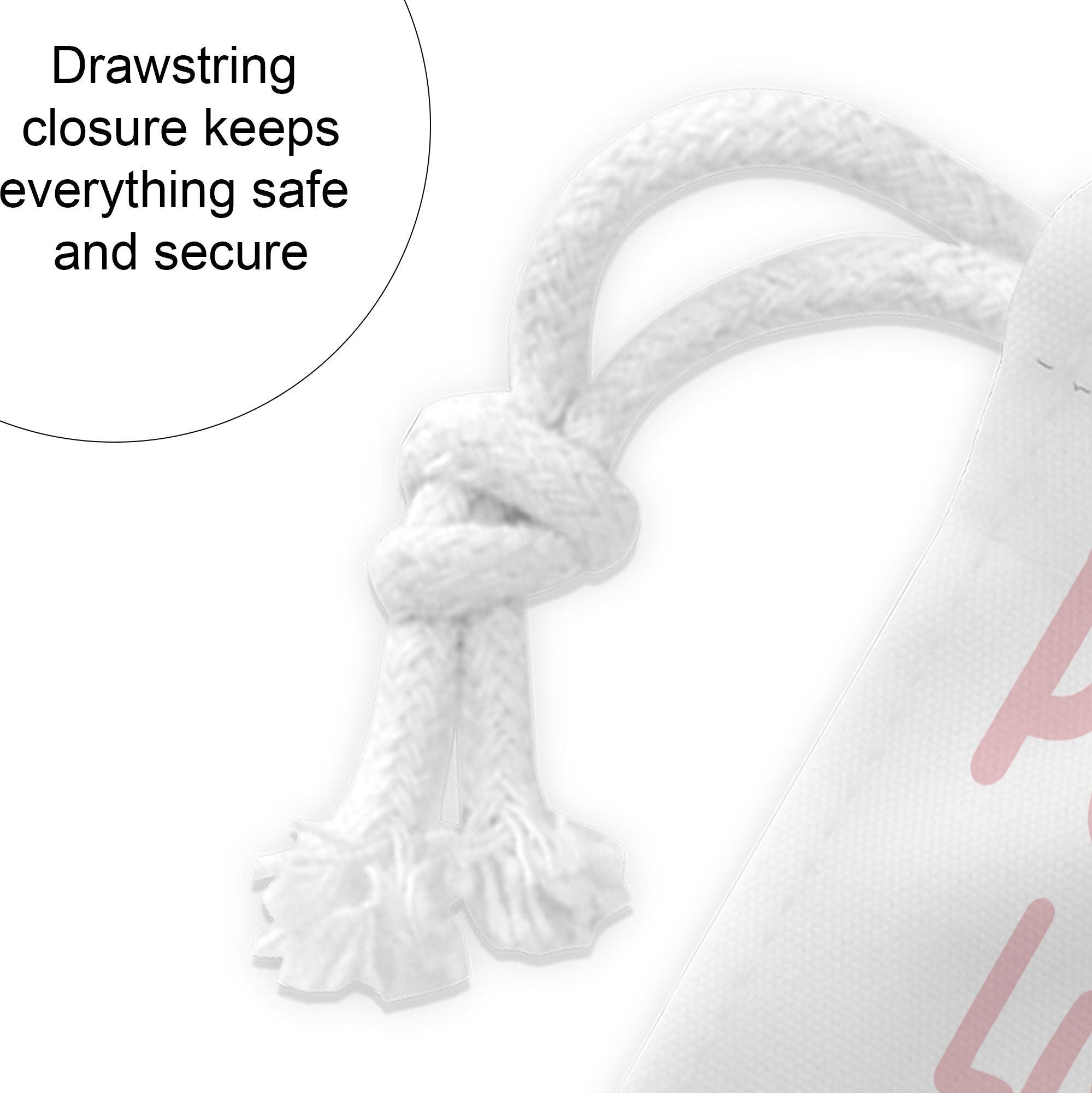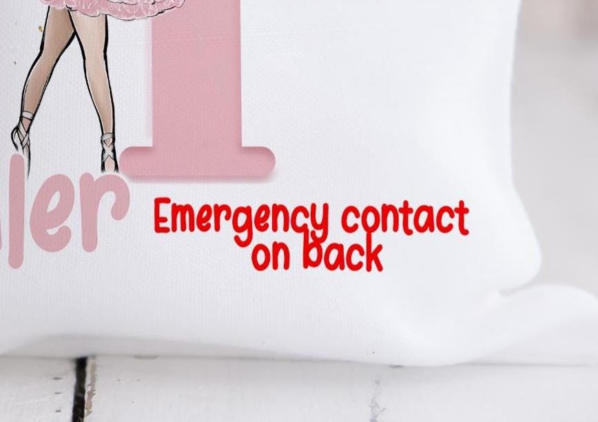 • White drawstring bag with beautoful ballerina and initial letter in pastel pink colours. Bag shows Initial of first name and a character with text reading name inhaler if you choose to have emergency contact on back it will state this is available on the front.