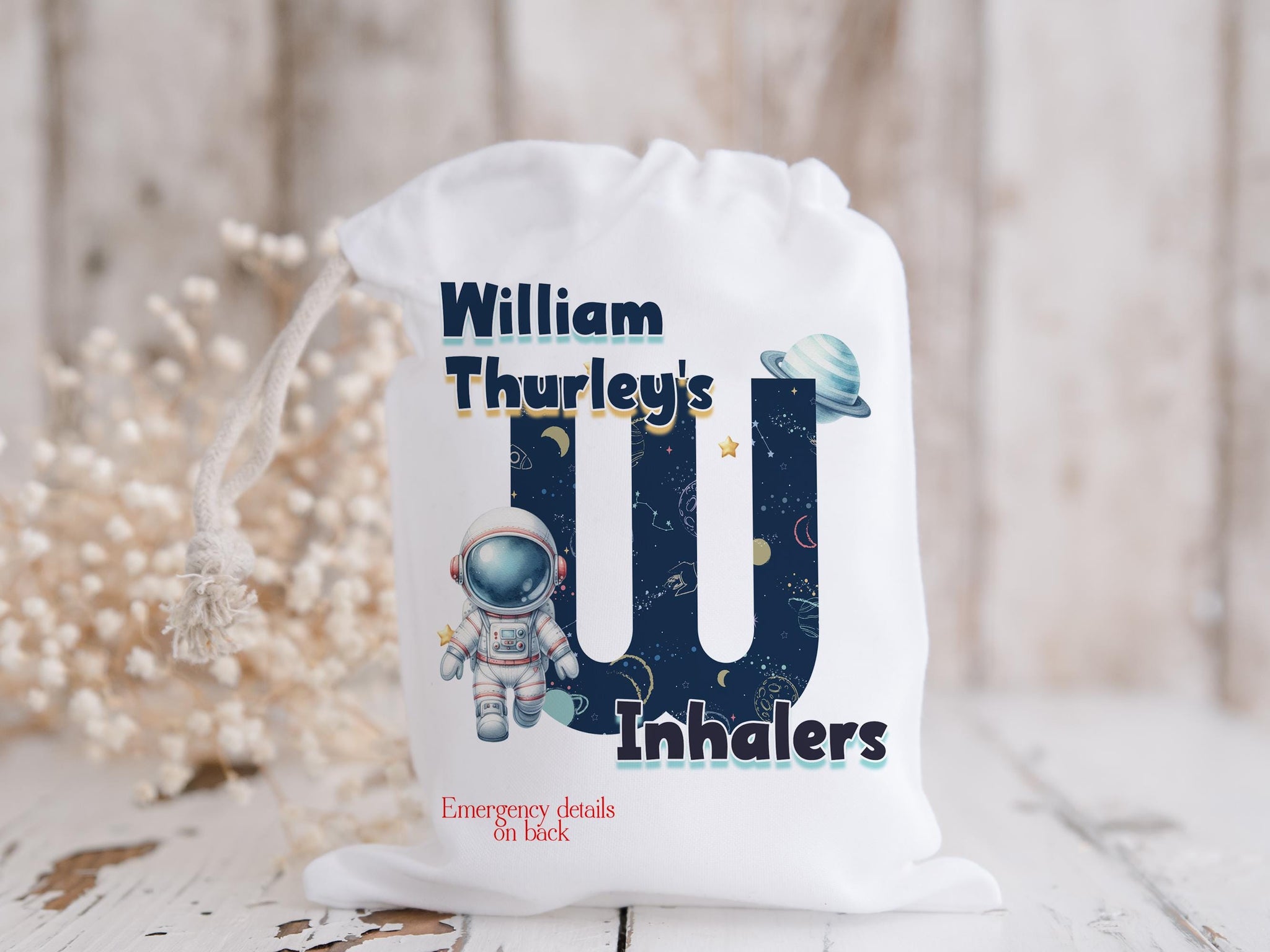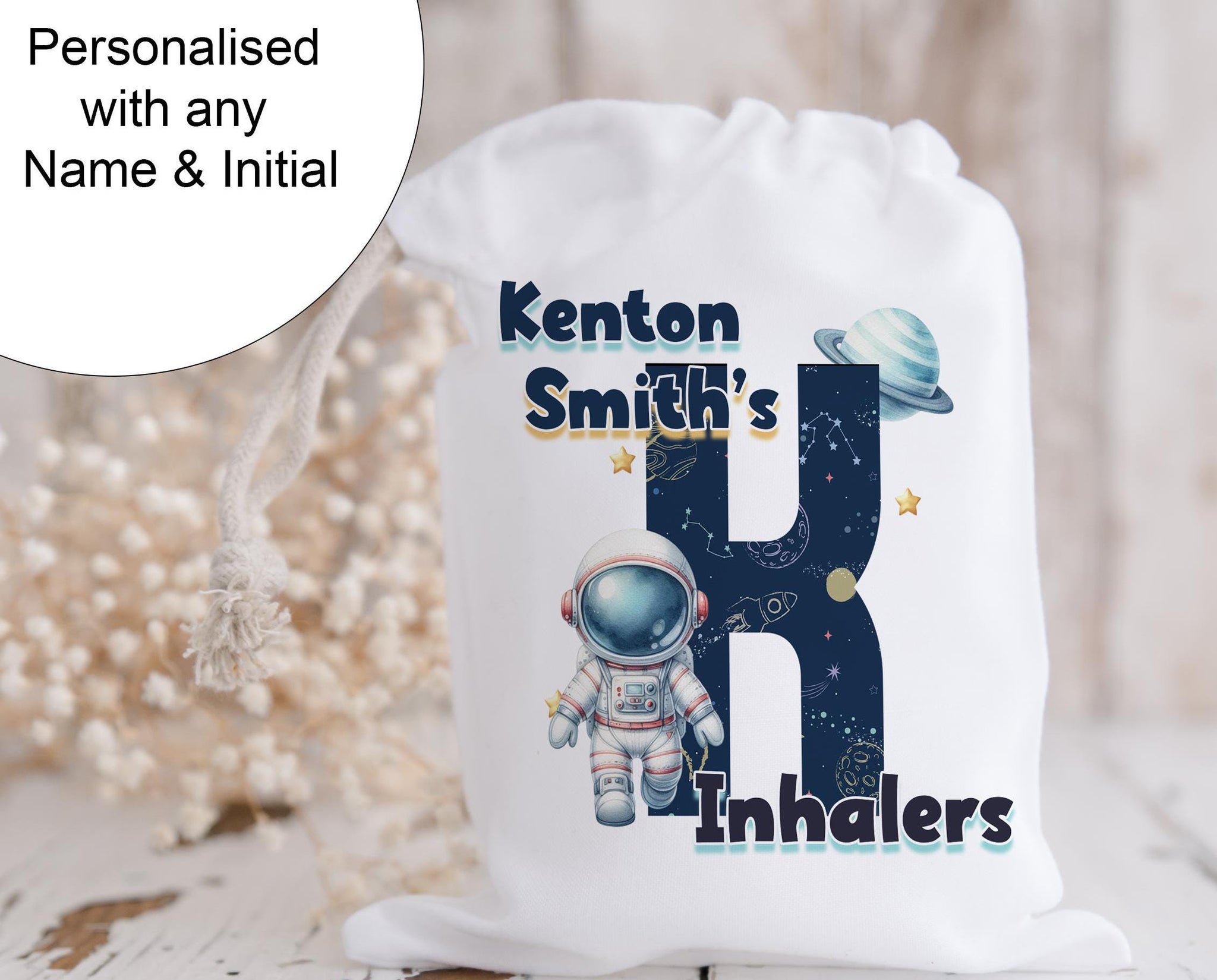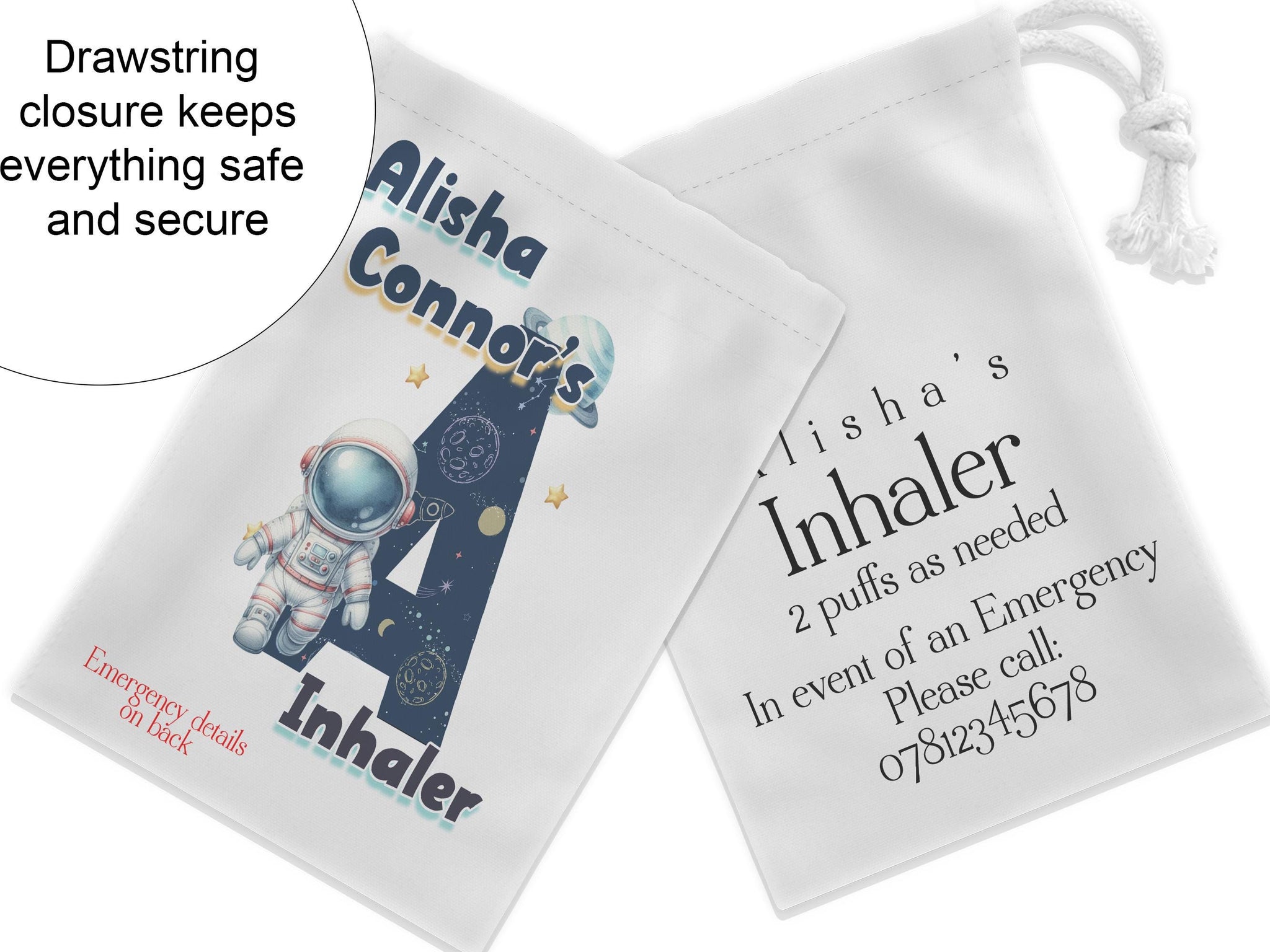• White drawstring bag. Printed with Initial of first name in a space theme with astronaut & text reading name's inhaler if you choose to have emergency contact on back it will state this is available on the front.