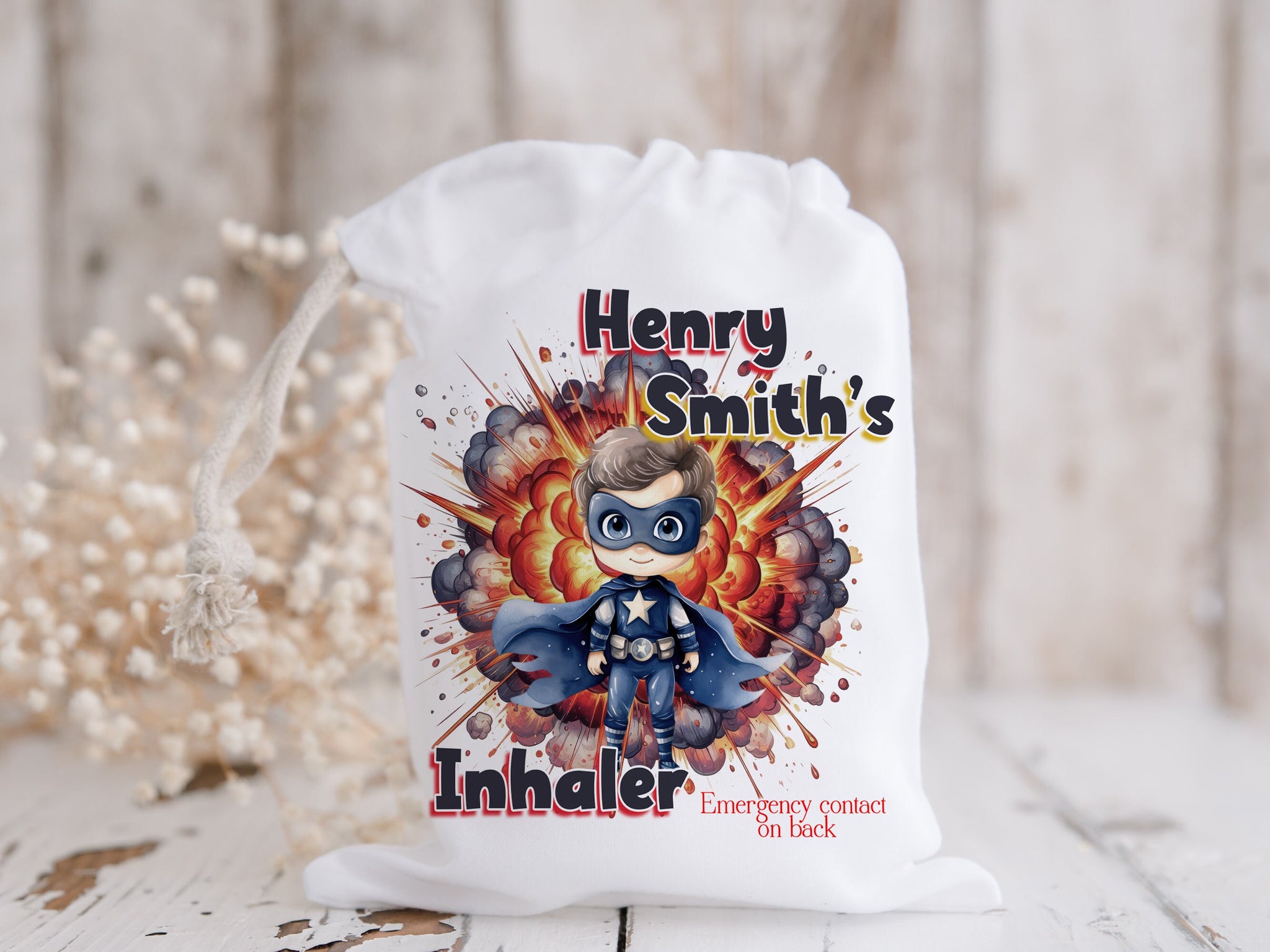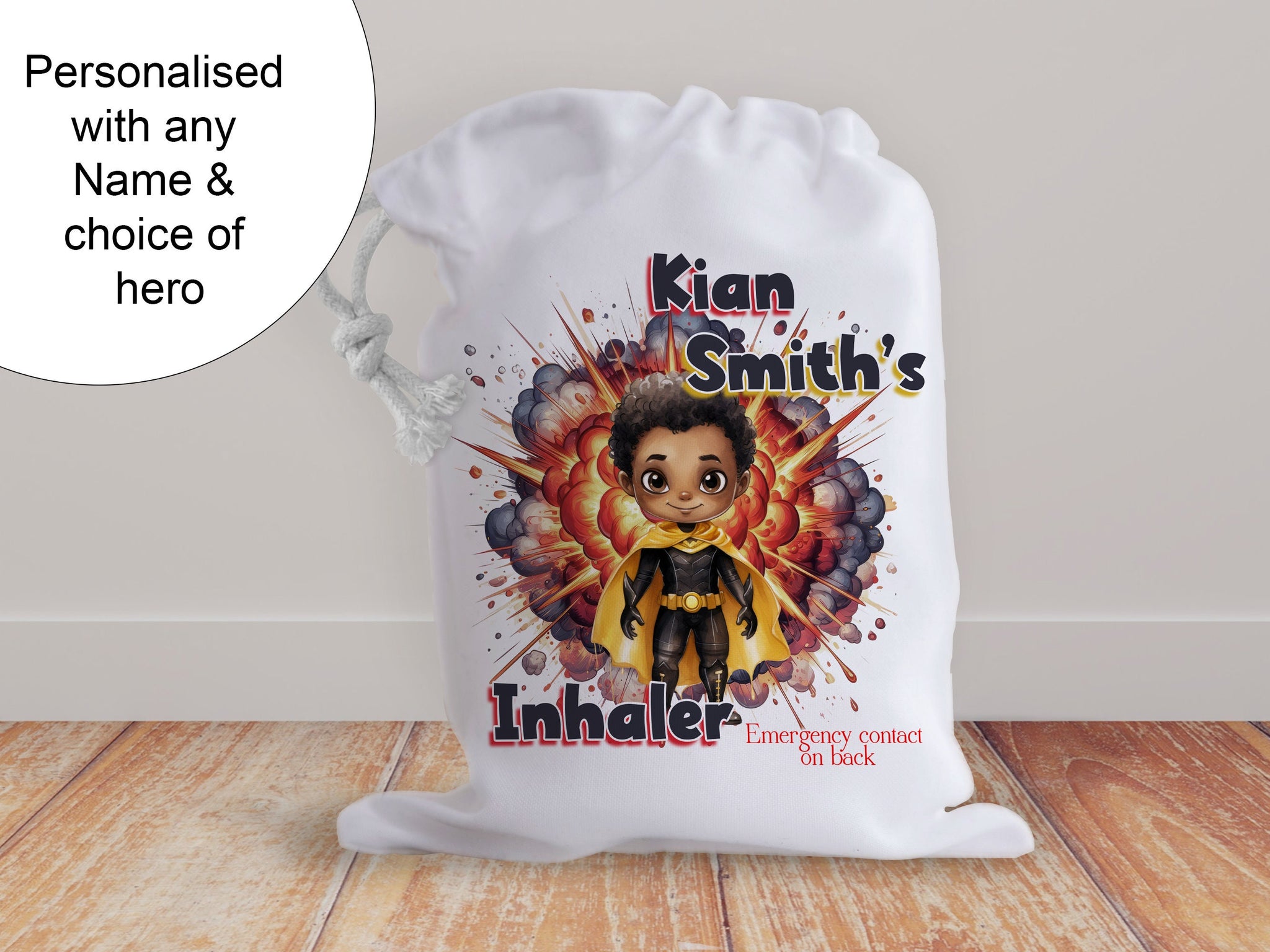 Superhero character Inhaler bag for school and travel, Personalised medicine bag for children, Inhaler and spacer drawstring storage,