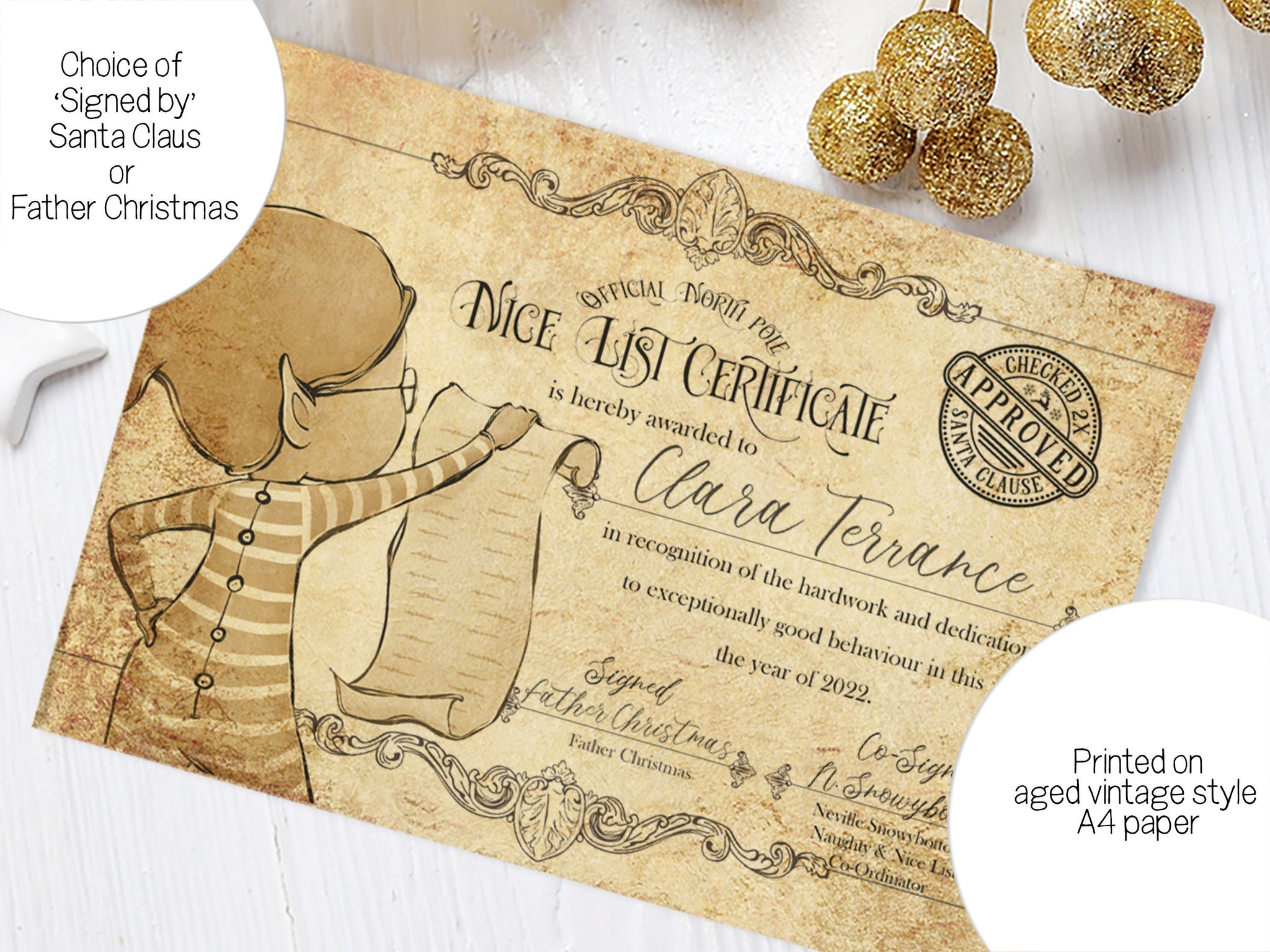 • Nice list certificate printed on aged A4 pale Vintage style brown paper with darkened age spots. Printed with an elf holding Santas Nice list A circle checked 2x and approved stamp in the top corner. Space for Name & Signed by the big man himself.