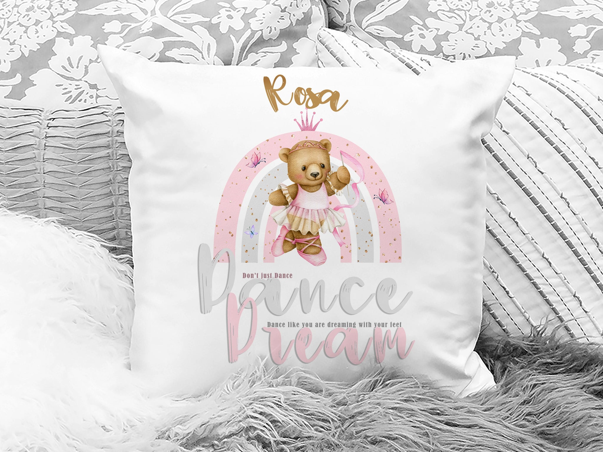 This pretty ballerina cushion is sure to put a pirouette in your kid's step! Crafted from cuddle-soft material, it's a sensory-seekers dream. Featuring a gorgeous teddy in ballet outfit along with their name for that special personalised touch. Its guaranteed to bring a sparkle to their bedroom decor making it the perfect gift for any little diva!