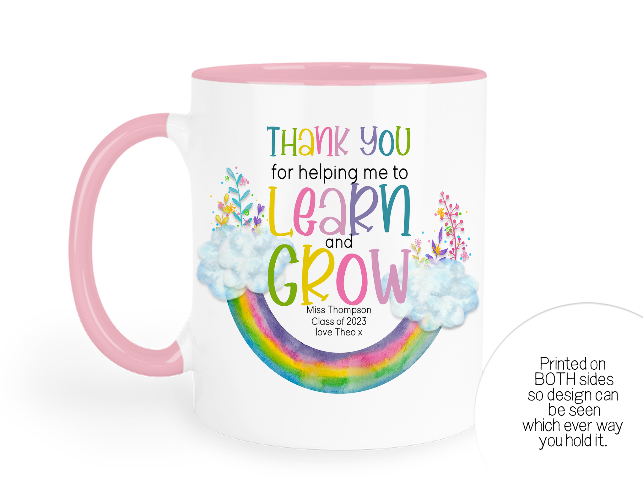• Plain white Ceramic mug. An upside down rainbow with clouds and matching florals at either end with the words Thank you helping me to Learn and Grow. Teachers name Class of 2023 and optional from name