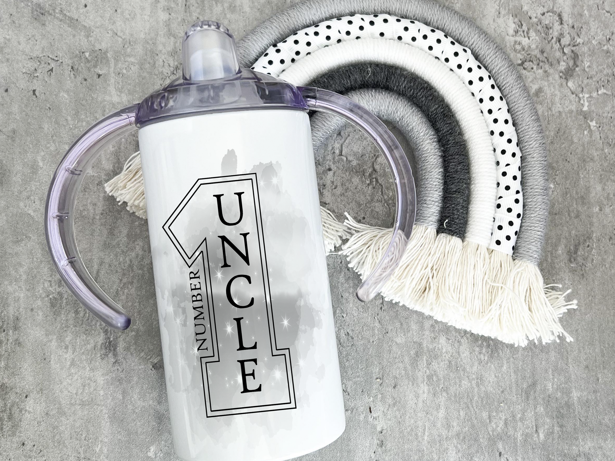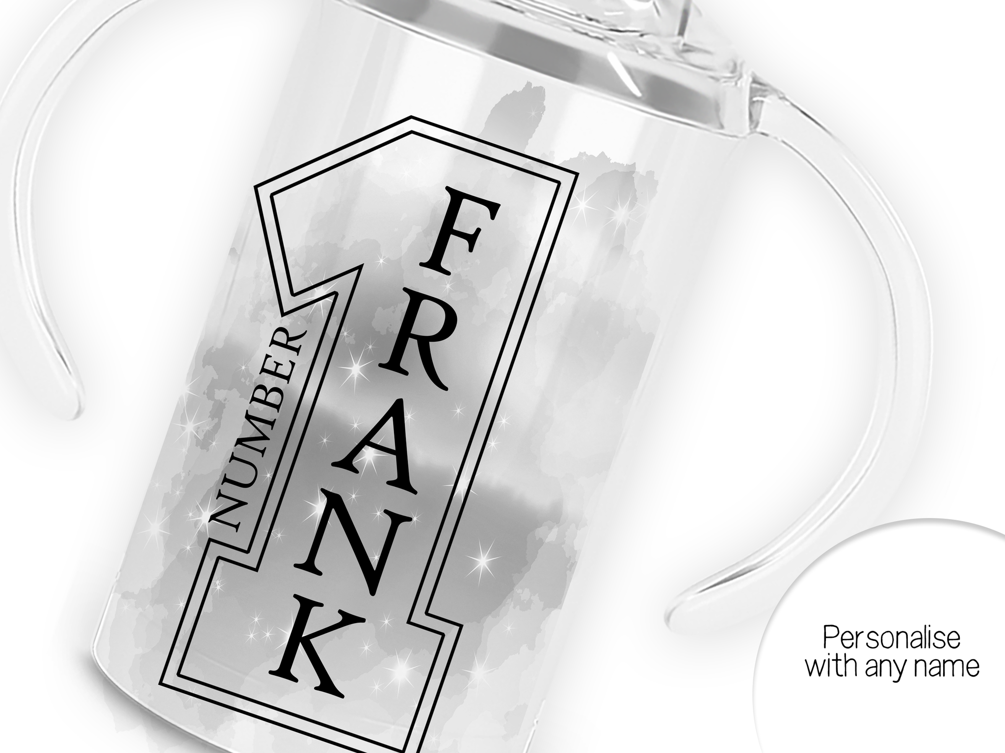 • Printed Tumbler with clear plastic Two handled Sippy cup lid. Great for adults with disabilities and kids alike Design is Black white and grey Number 1 with the name or title written inside the number.