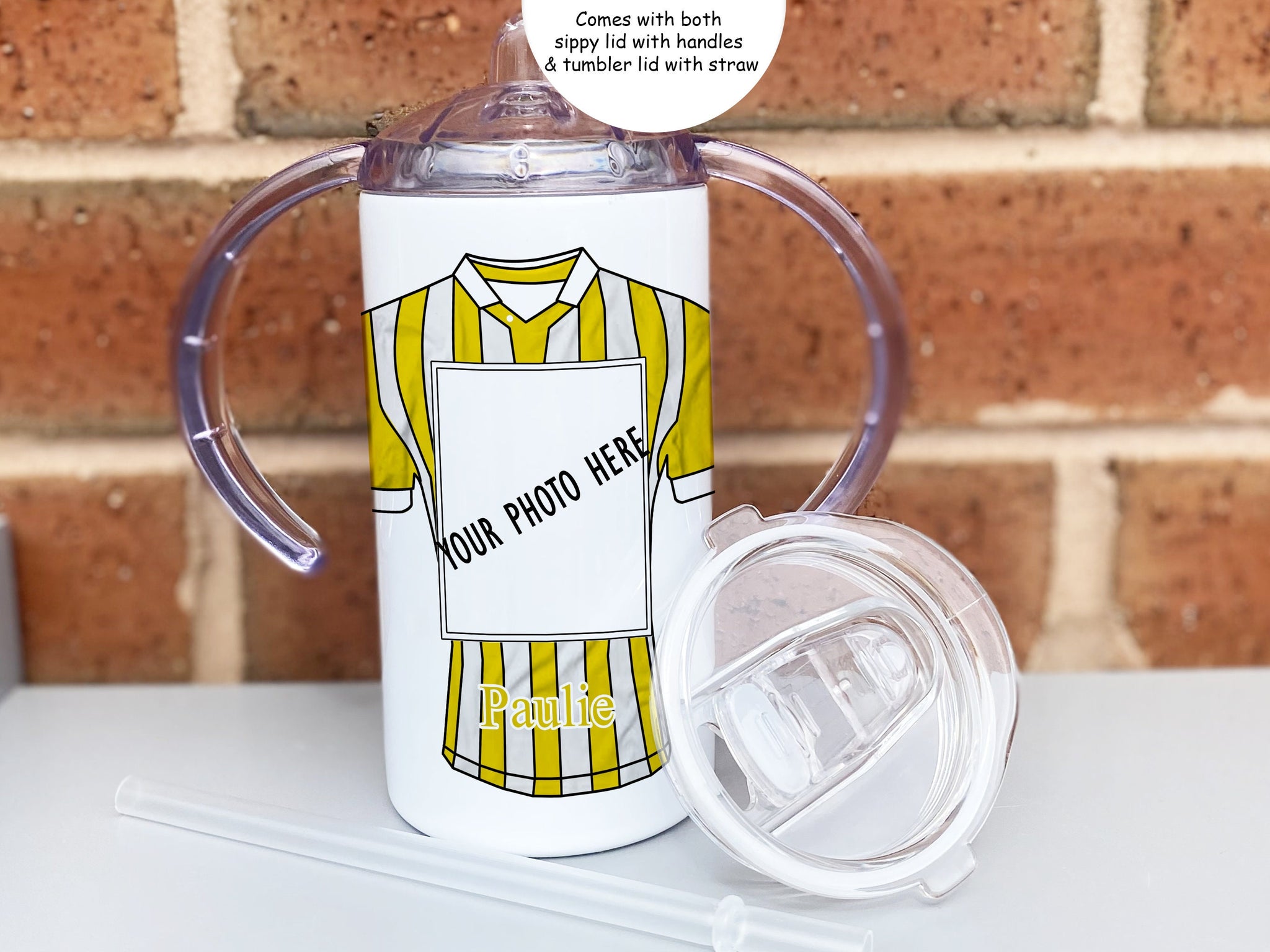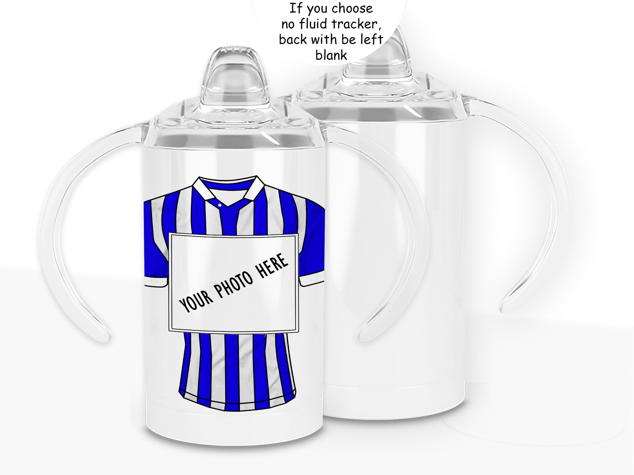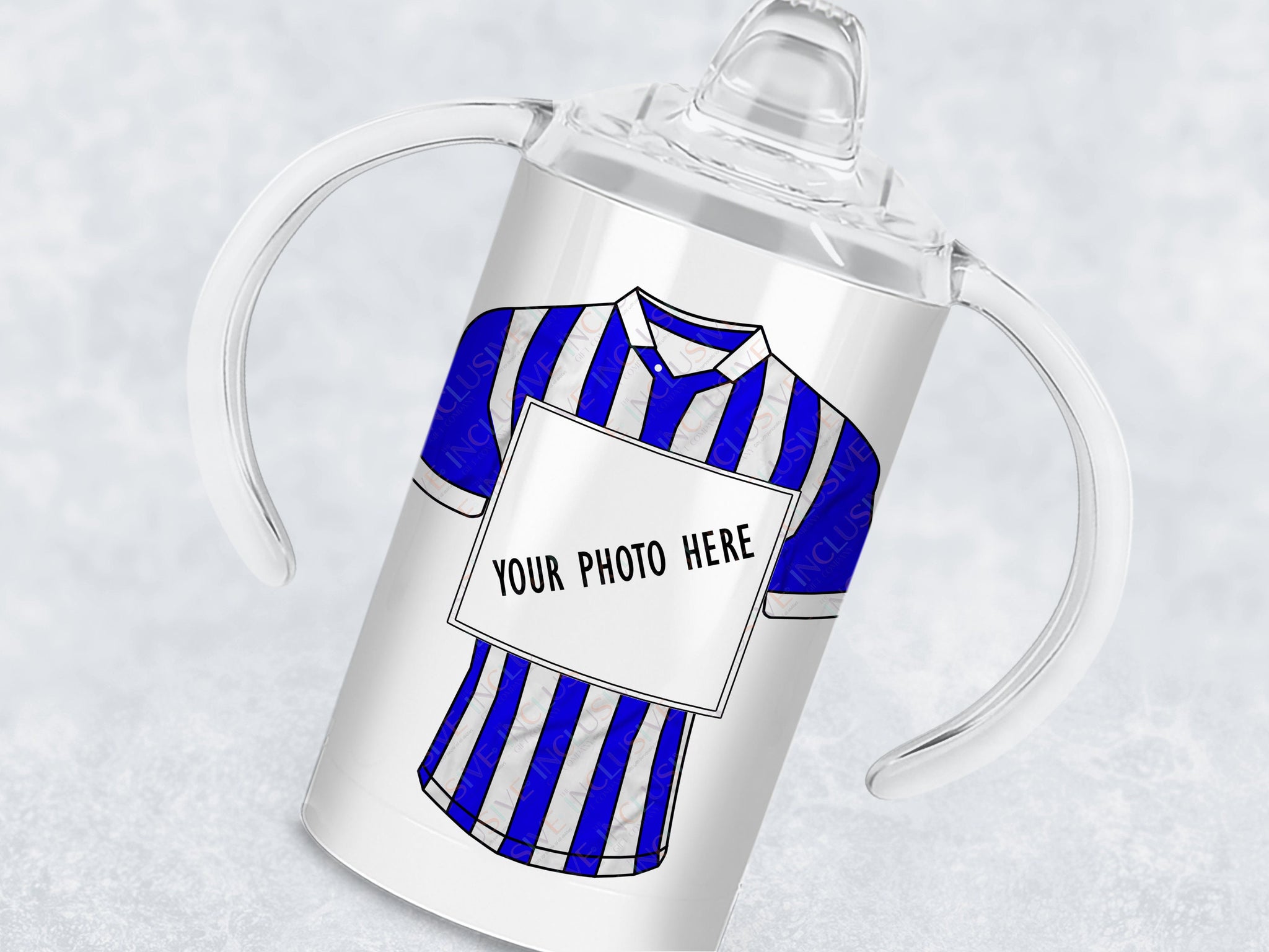 • 12oz insulated Sippy cup with spout for adults and children with disabilities Printed with striped football shirt in colour of your choice with a photo of your choice displayed in a square frame in the centre