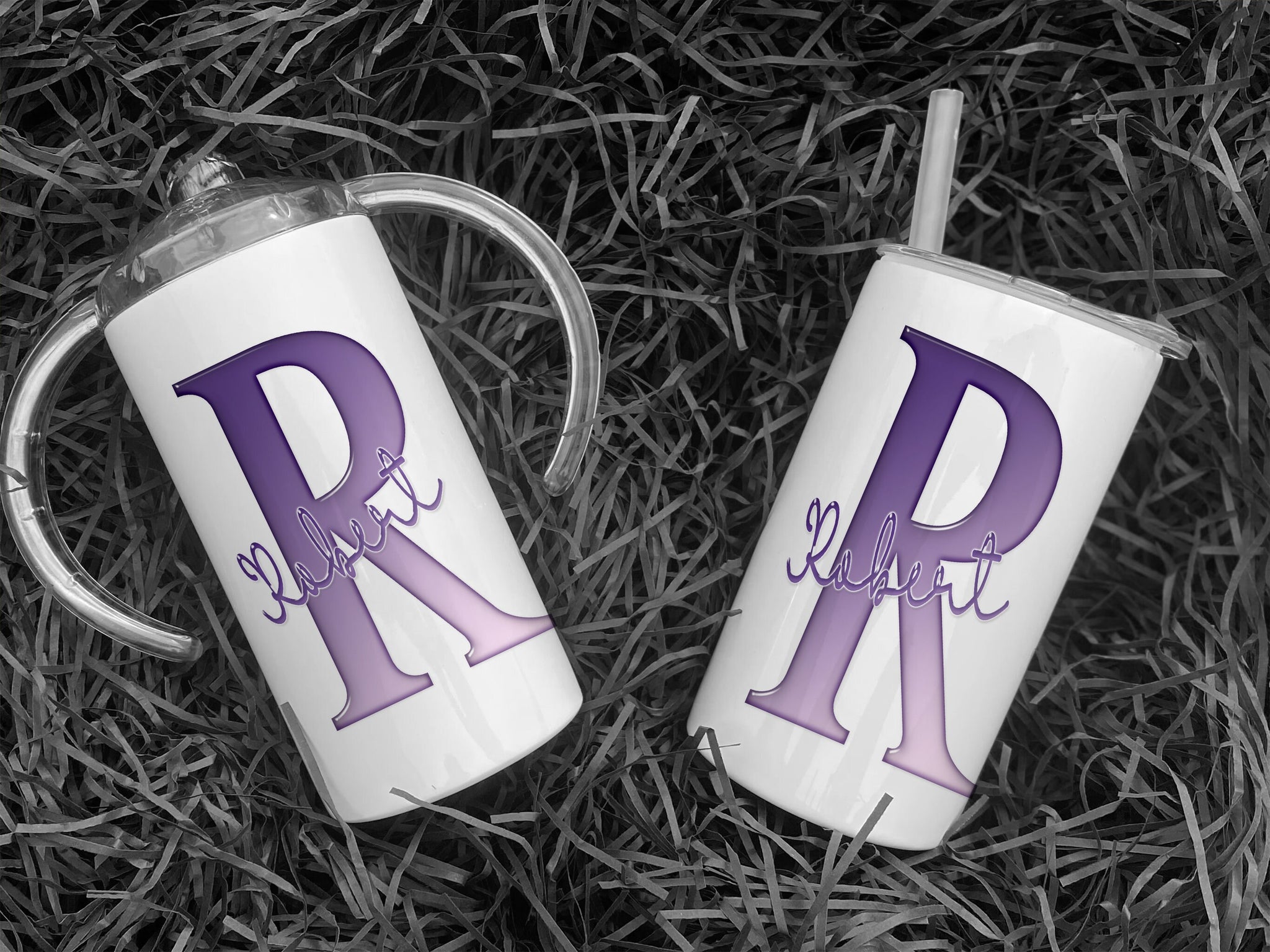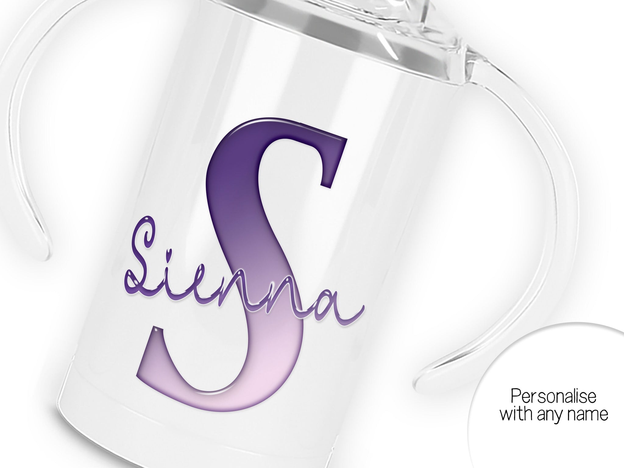 • White Stainless steel Sippy cup with clear plastic lid with spout and large handles. A glossy Purple and white Initial with Name in script written across in matching purple.  An additional flat lid with no handles and straw is supplied.