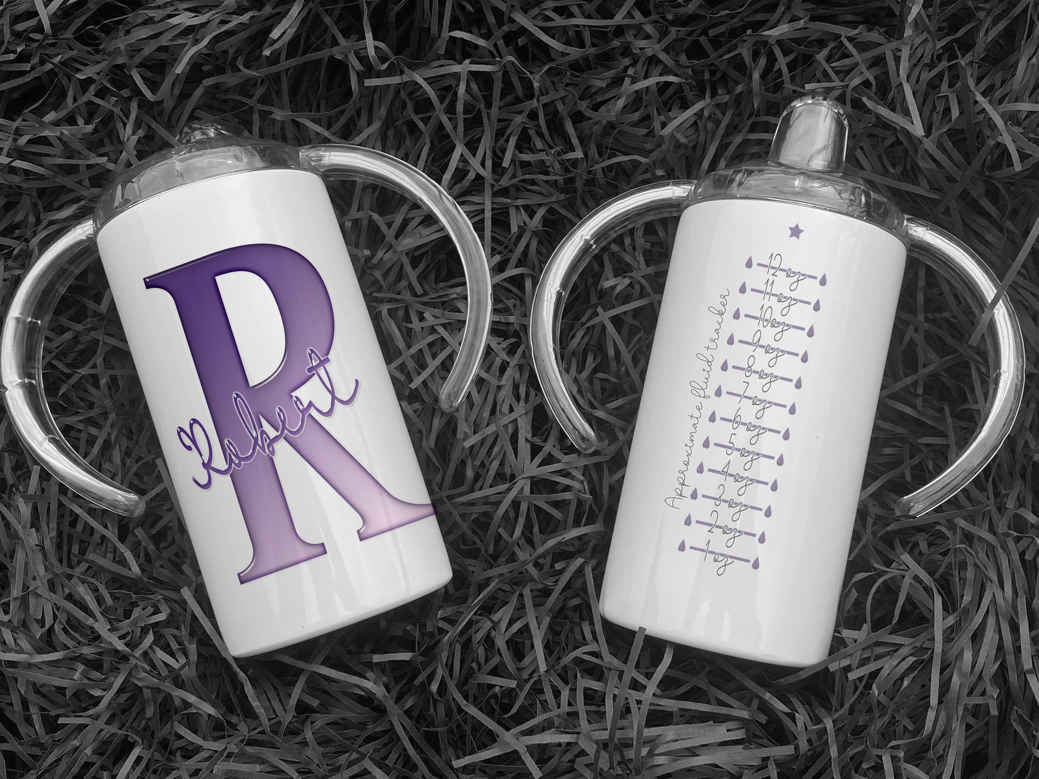• White Stainless steel Sippy cup with clear plastic lid with spout and large handles. A glossy Purple and white Initial with Name in script written across in matching purple. the back has an approximate fluid guide in matching purple