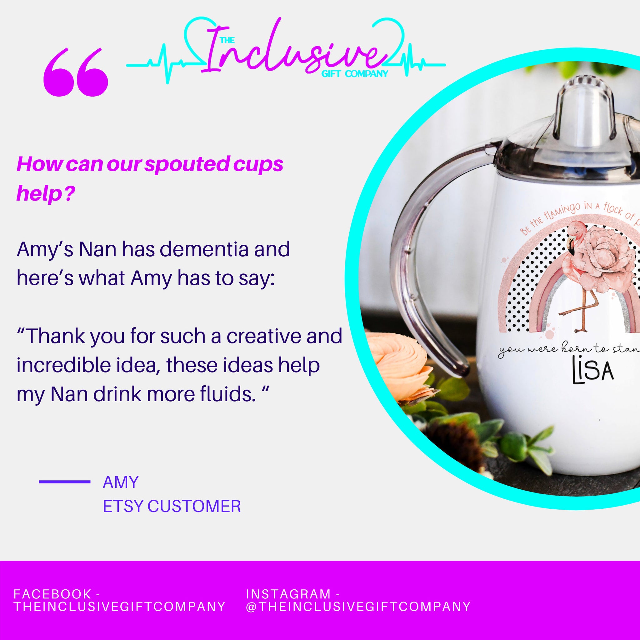 Embrace the pleasure of self-reliant sipping and elevate your daily routine with our Personalized Adult Sippy Mug. The perfect blend of style, practicality, and heartwarming design this custom insulated cup with the choice of a two handled lid with spout or a tumbler style straw lid is a thoughtful solution for adults and children of all abilities, making it an ideal choice for gifts for those living with life restricting diseases like Dementia and Alzheimer’s Disease.